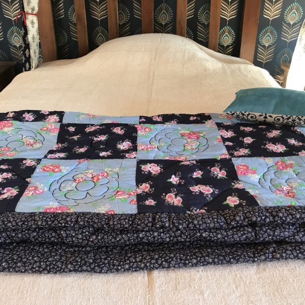 Beaucoup de charme pour ce jeté de lit aux dominantes bleues. Un patchwork de trois imprimés différents. On aime son air bohême.