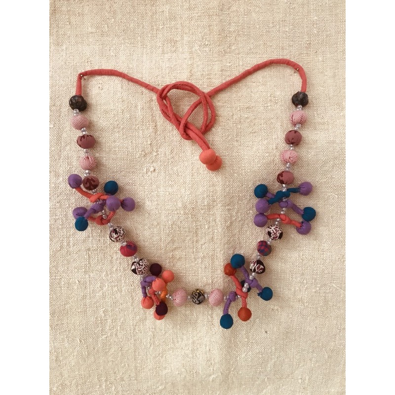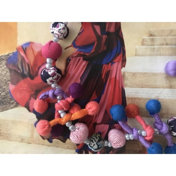 couleur : dominante violet; avec des bleus, des roses-corail. Les cordons peuvent être de couleur différente : bleu, vert, turquoise, corail, violet, qui ne se voient pas quand porté.Â