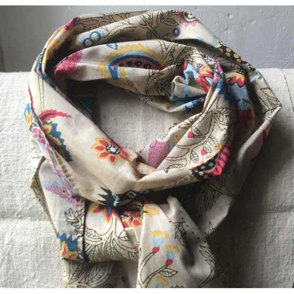 D'après un prénom indien; une jeune fille du village des Indigotines. Couleurs légendaires des Indes, chaleur du beige - sable et de l'ocre - terre. Tissu sourcé avec bonheur au Rajasthan, état des maharajas (Raj - Roi).